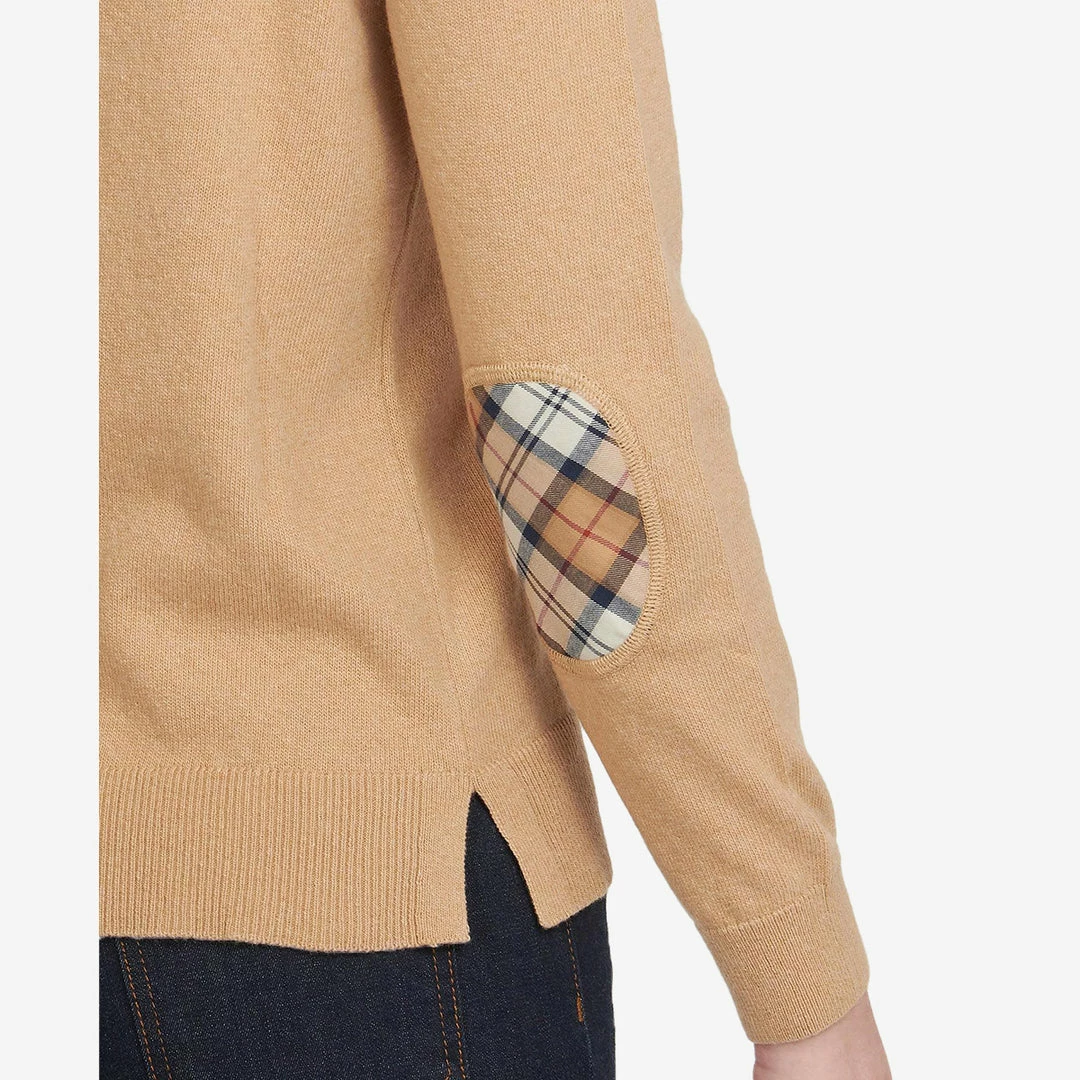 The Barbour Pendle Roll Collar Jumper boasts a neat fit and is made from a soft wool-cotton blend. Available in the warm and cozy color caramel for fall, this jumper is perfect for layering on cooler days.