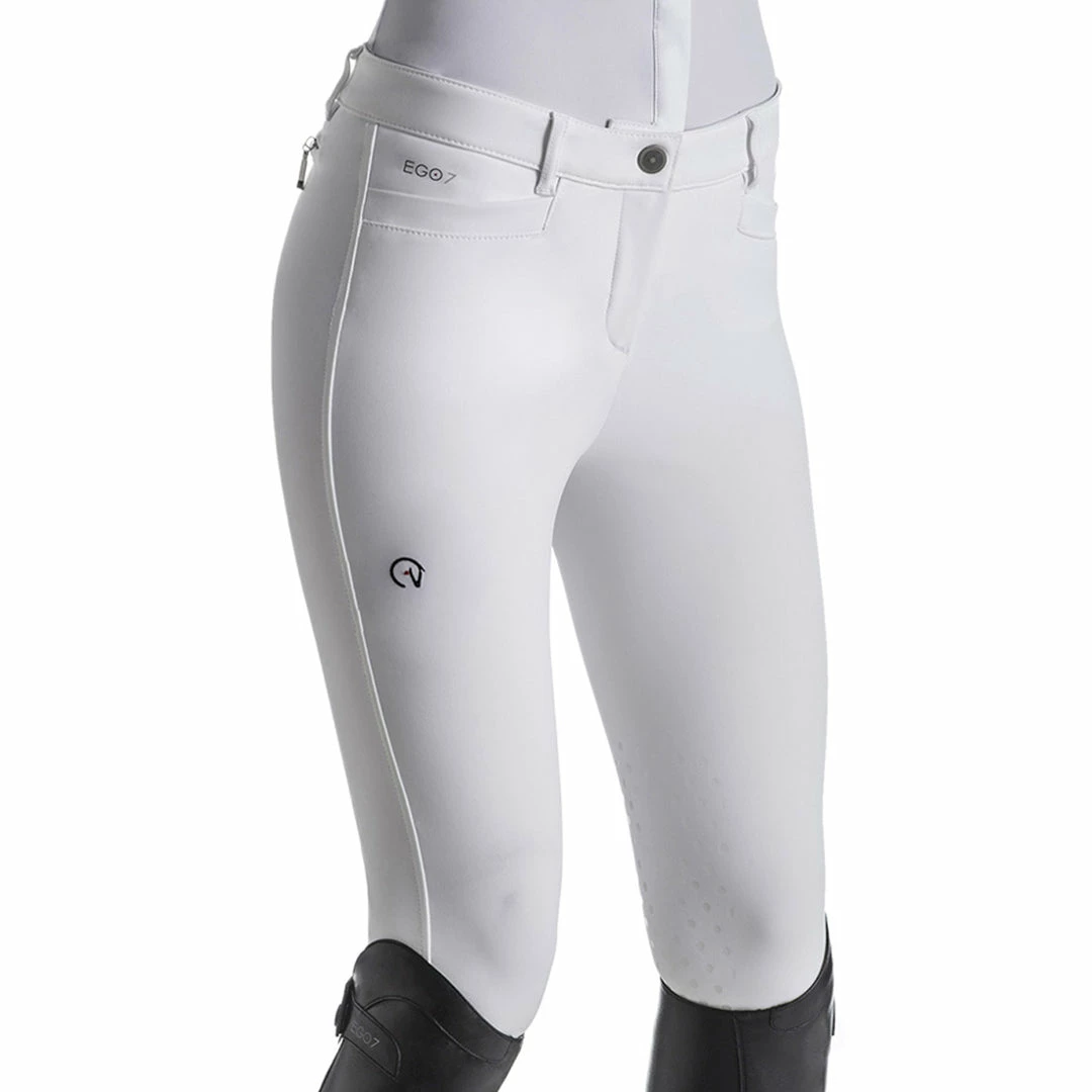 The Ego 7 style with flattering front pockets and faux zip detailing on the back gives them a fantastic look. Superior performance and style are guaranteed thanks to the signature cut and design that Italian designers developed. The revolutionary fabric, 100% jersey made in Italy, creates a perfect fit while the 4-way stretch fabric ensures unrestricted movement, support, and shape retention to give you never before felt comfort. Highly breathable, the breeches offer increased contact with the horse while riding.