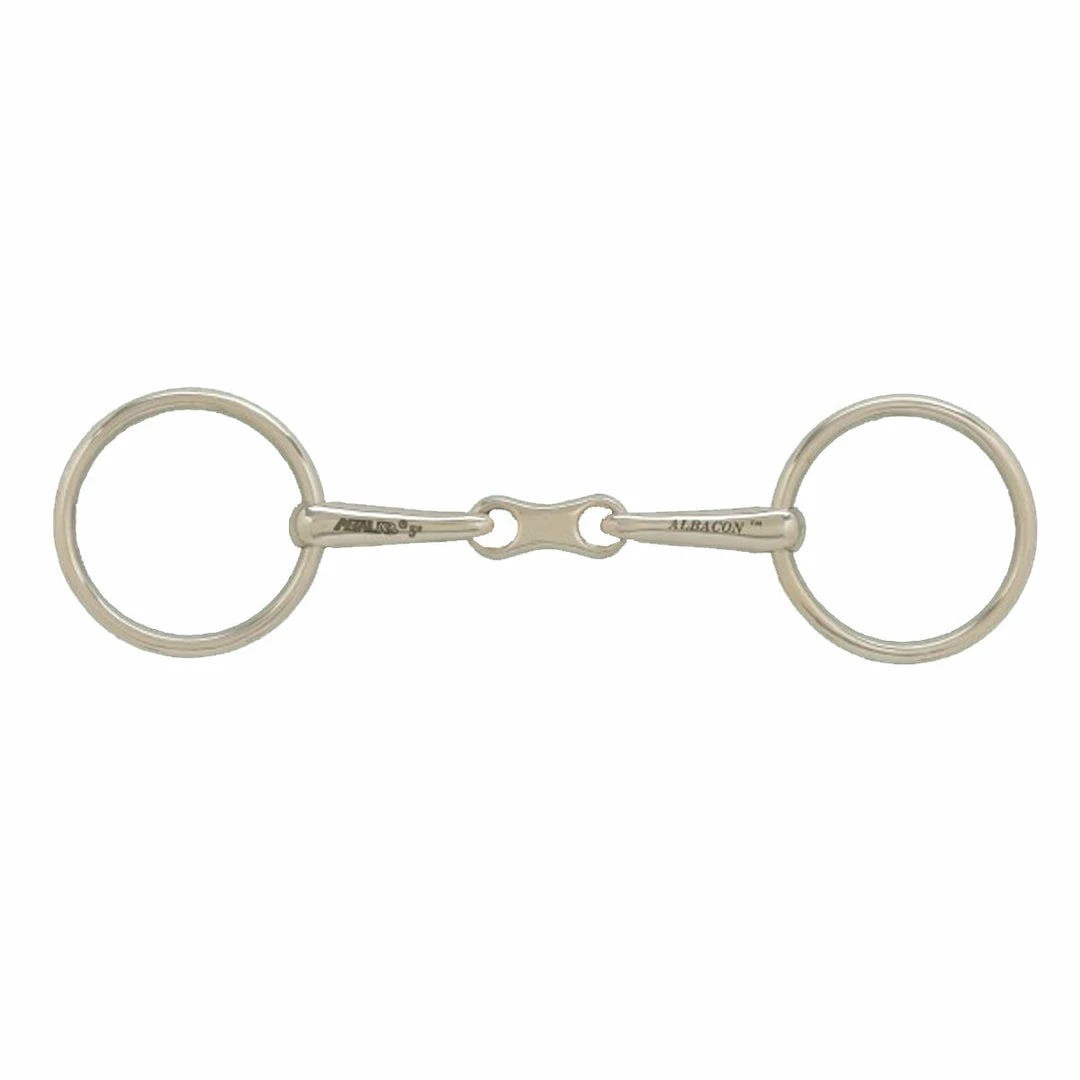 We love the AlBaCon German Silver 13 MM French Mouth with 65 MM Loose Ring Bit because the high copper form of German Silver stimulates salivation and helps prevent dry mouth, yet it has the same appearance. Excellent bit for a horse beginning training or a school horse with beginner’s hands.