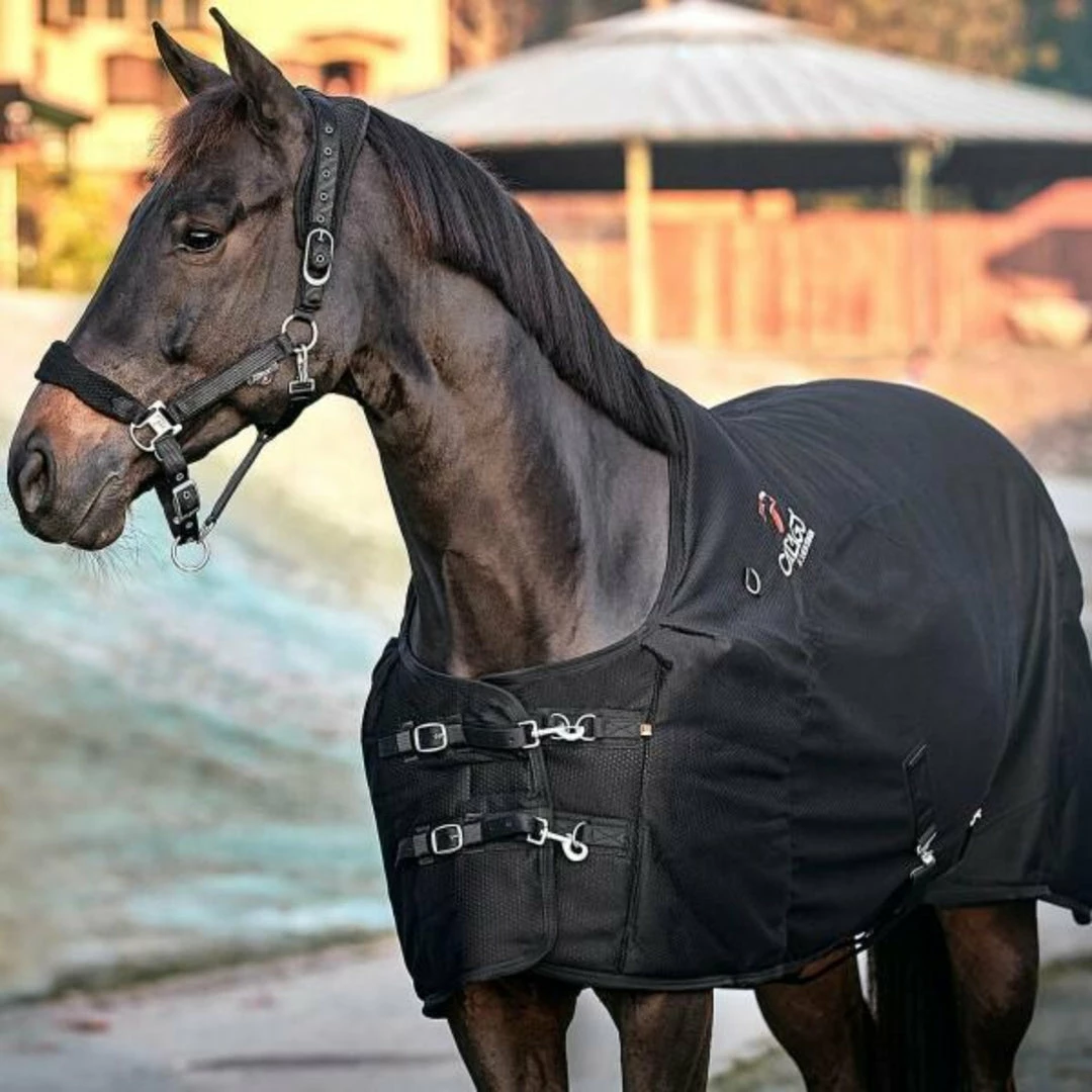 Features back plate of Synthermax fiberfill covering the main muscle groups and lined with woven ceramic particles which give an advanced double-acting effect. Ideal for providing enhanced well-being, reducing recovery periods, and warming the muscles, tendons, and joints – before and after paddock, training, and competition. Optimal fit with cross surcingles and a secure snap front closure. Includes d-rings at neck for attachment of optional neck cover (sold separately).