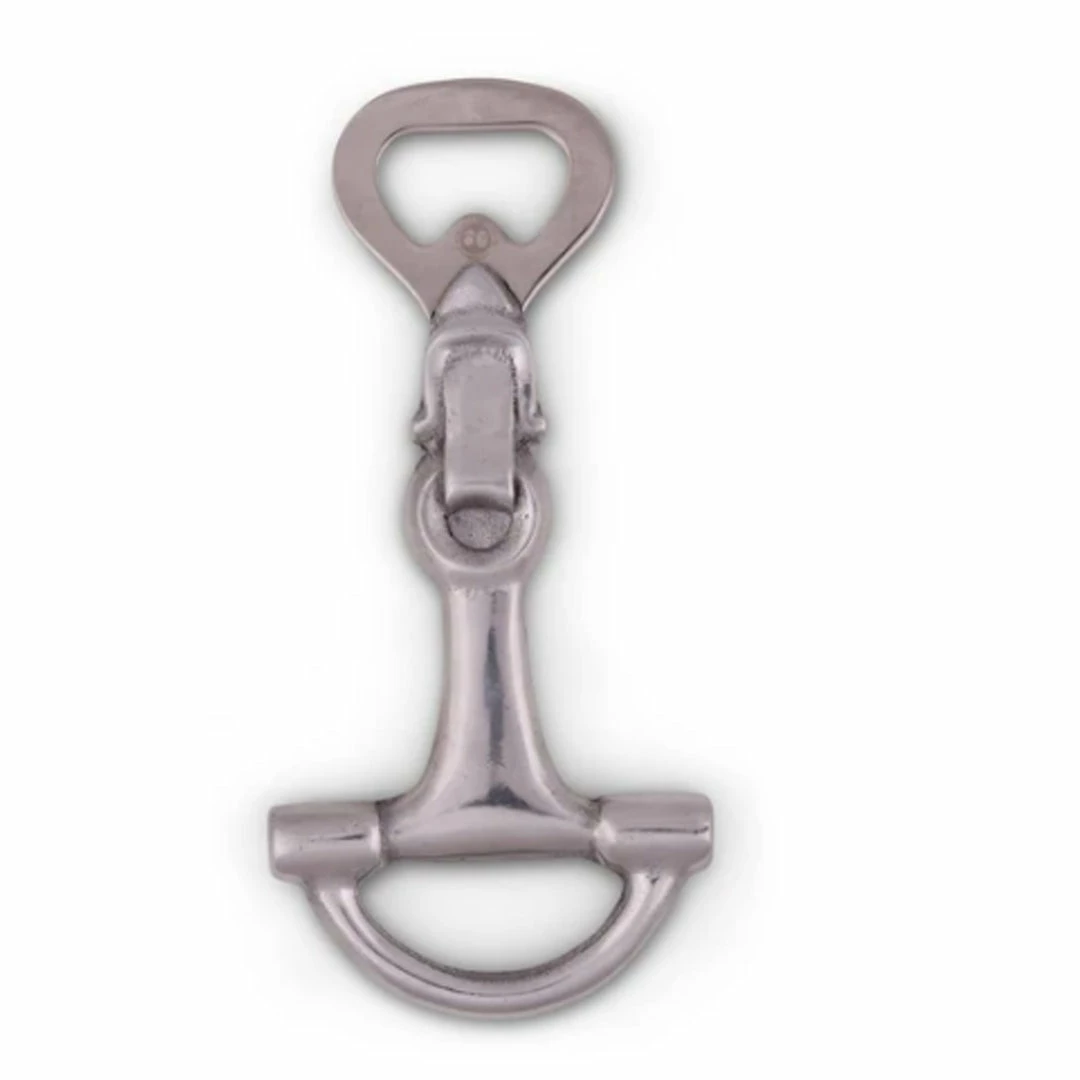Saddle up and enliven your bar decor with the two-bit bottle opener from the Equestrian Collection by Arthur Court. Sand-cast aluminum is rendered in the shape of a classic Western bridle bit, a perfect addition to the horse-lover’s rustic kitchen decor. The opener tip is made from stainless steel, firmly welded into place on the bit handle making the opener extremely durable, ideal for opening even the toughest caps. This bottle opener is crafted from a designer aluminum alloy, fully compliant with FDA regulations for food-safe materials, as is the stainless lever. To clean your bottle opener, wash with gentle soap and warm water, then dry immediately.