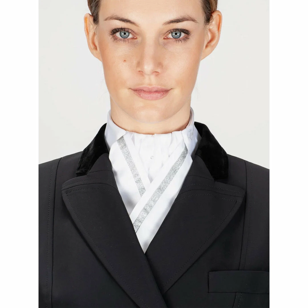 Stock tie with silver ribbon detail along the sides and rhinestone on collar. The CLOE is a perfect stock tie to add some extra style to your show ensemble. Velcro back closure.