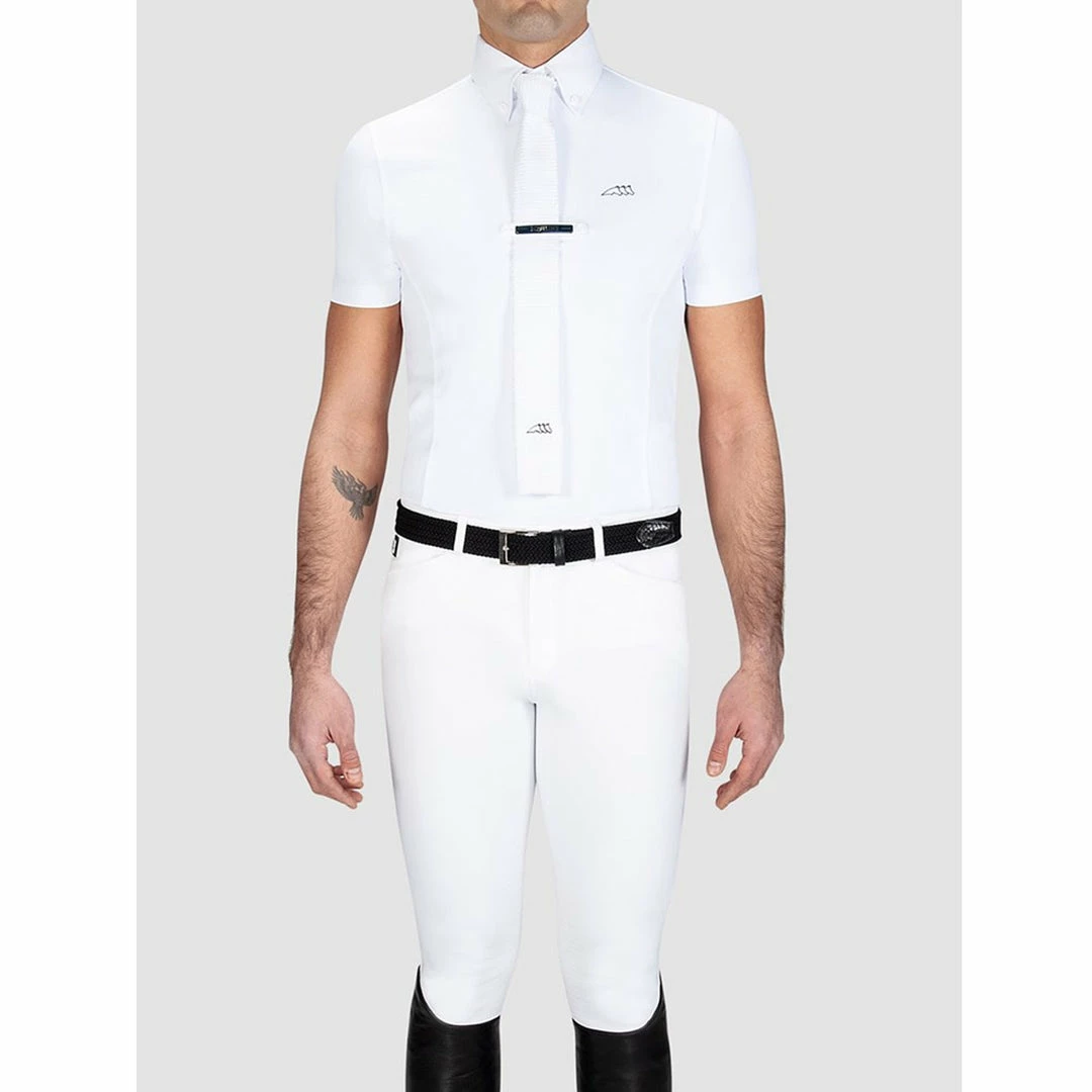 We love the Menโs Vick Short Sleeve Show Shirt because it was designed for the equestrian athlete. This shirt is made with Equilineโs X-Premium technical fabric, which will keep you cool and comfortable during your ride. Breathable and elasticized with a button-down collar in white poplin. The VICK also features a removable rubber clasp to keep your tie in place.