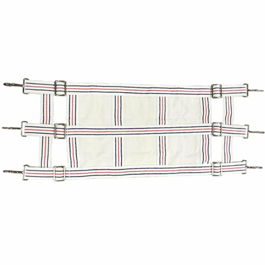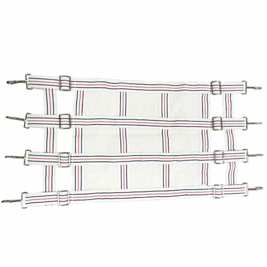 Cotton Stall Guard is made of rugged 2″ webbing stitched together. This white with royal and red striped guard is 16″ in height and adjust to 48″ in width. Heavy-duty nickel-plated hardware. Closed front to prevent the horse from putting a foot through it. Made with heavy-duty snaps.