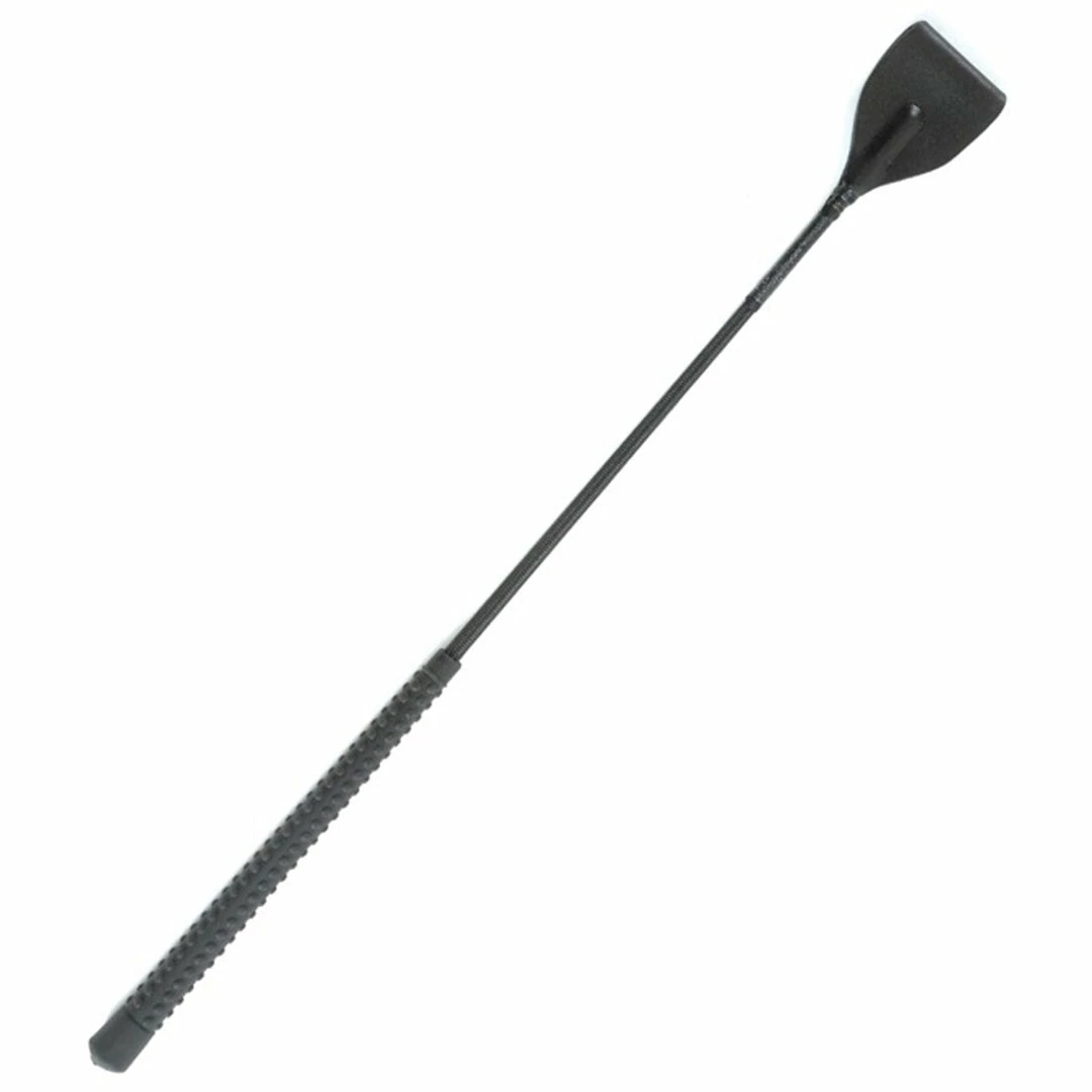 English style bat with molded rubber pimple grip handle, nylon wrapped fiberglass shaft and wide leather flap.