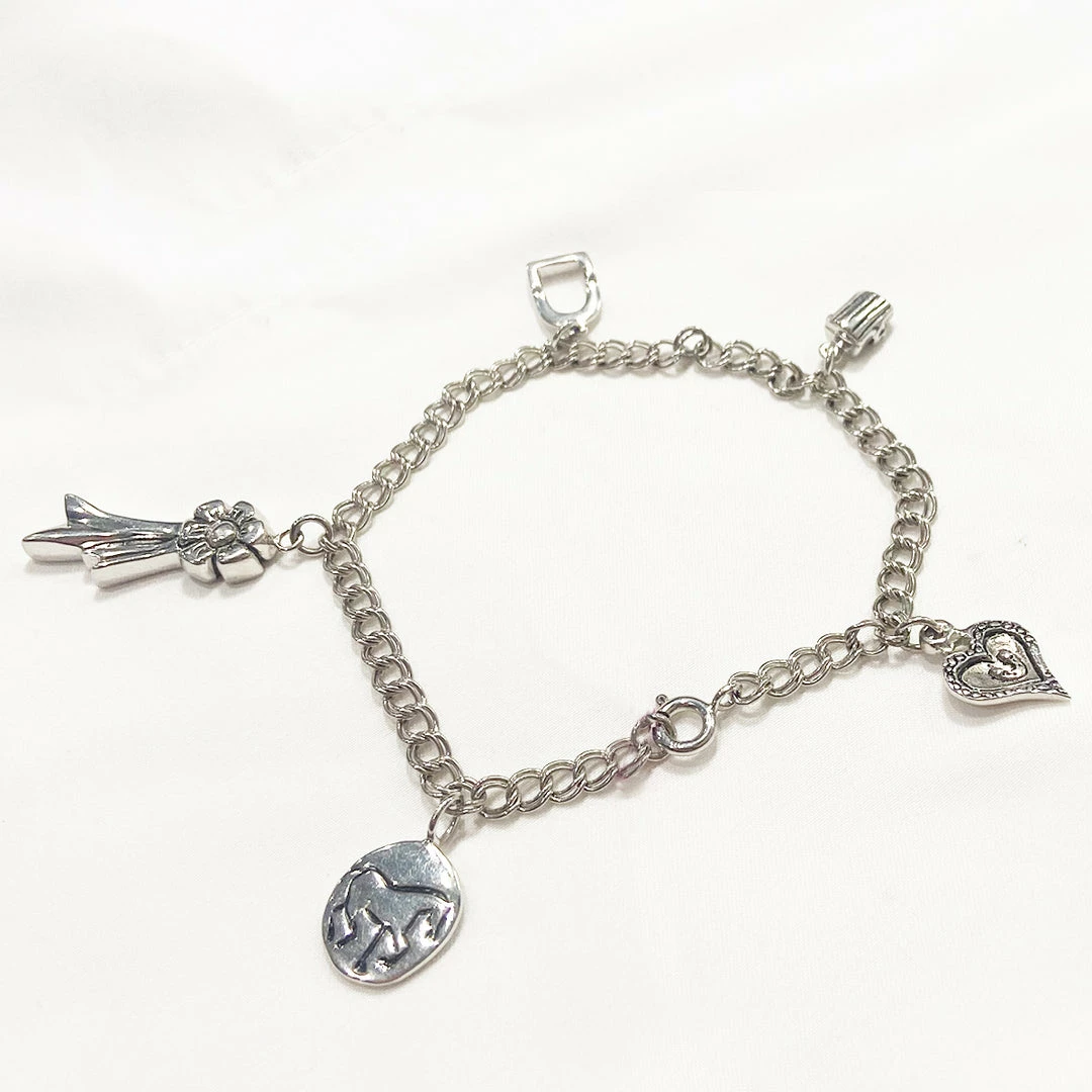 Sterling silver link bracelet with 5 equestrian themed charms. Made in the USA.