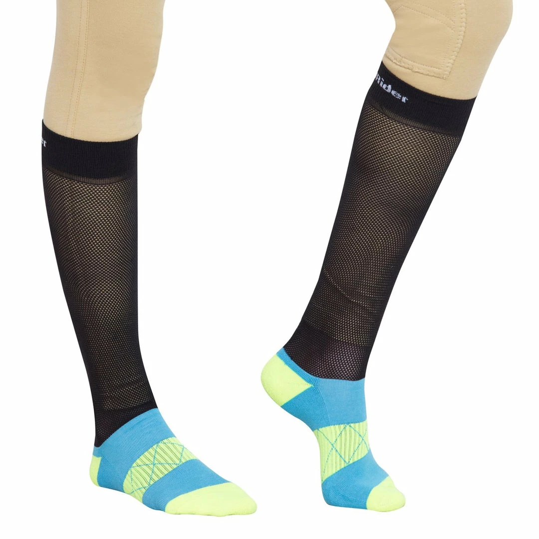 The new TuffRider EquiCool Ventilated Riding Socks are designed for the technical demand of riding footwear. A nylon mesh leg allows maximum ventilation, compression and ease of entry into riding boots. The bamboo/cotton foot has a terry sole for comfort and a ribbed structure for arch support. The natural properties of bamboo make them anti-microbial and quick drying.