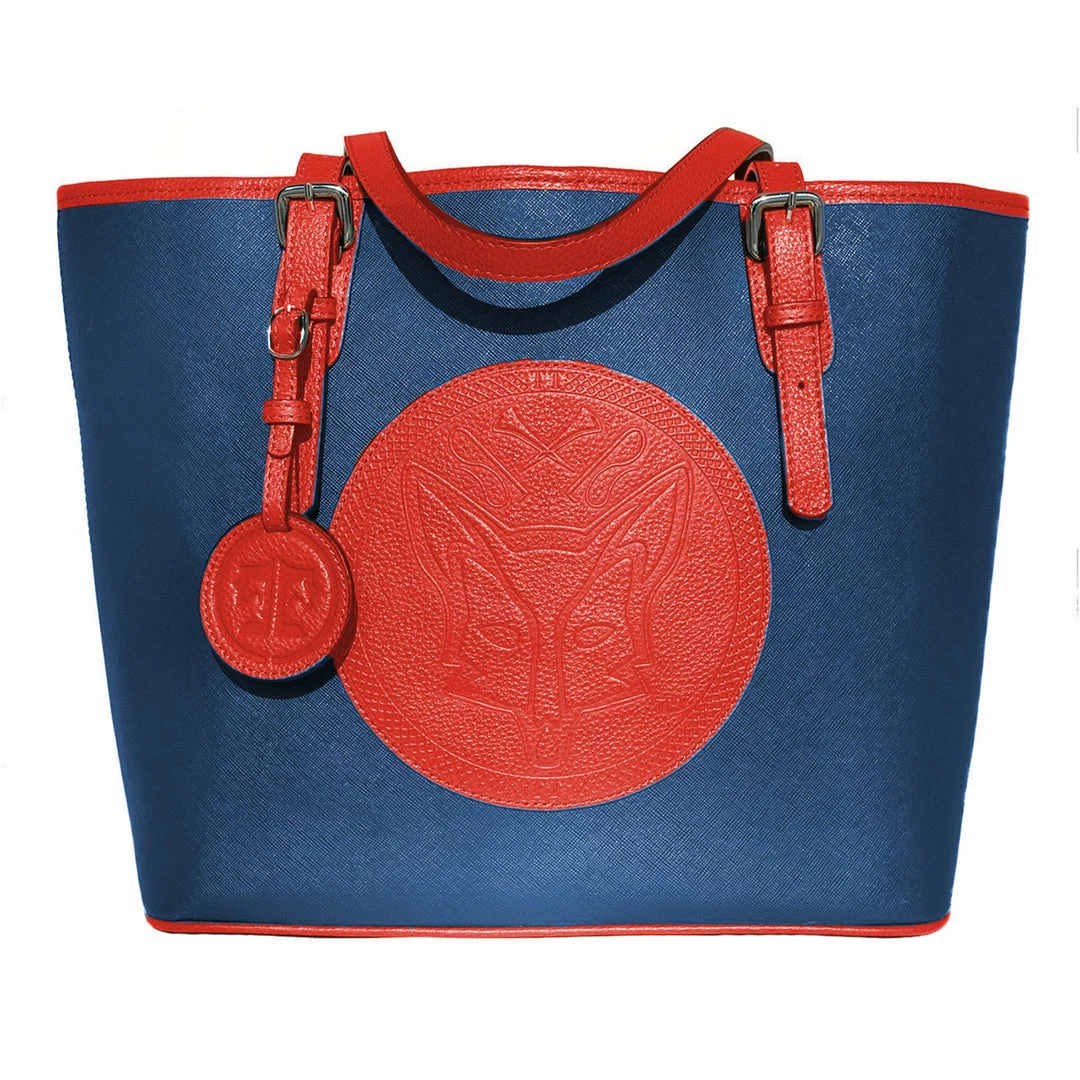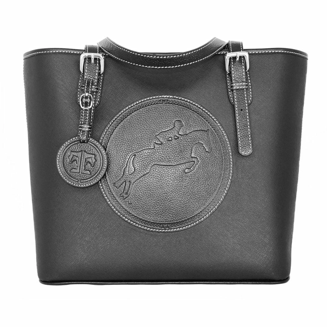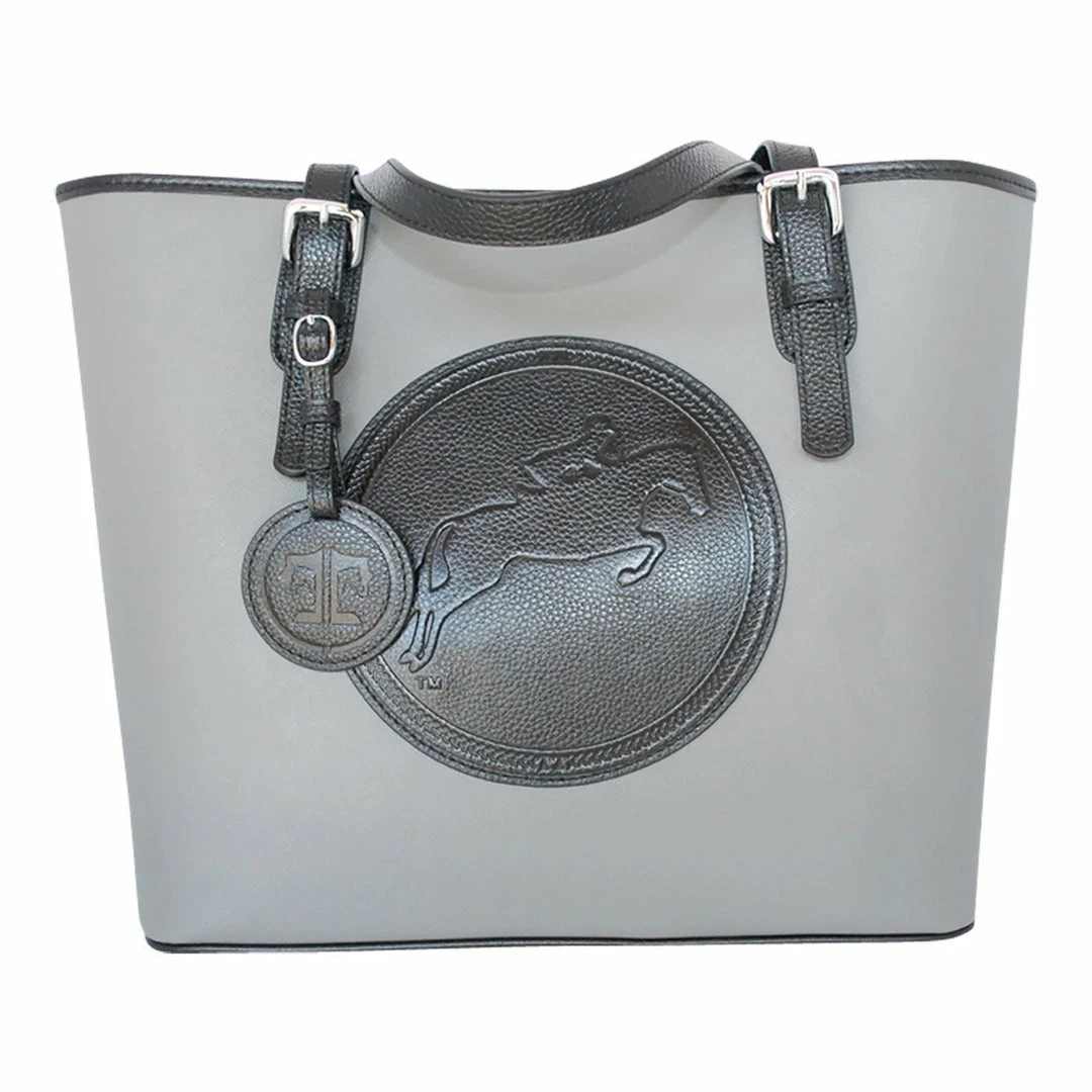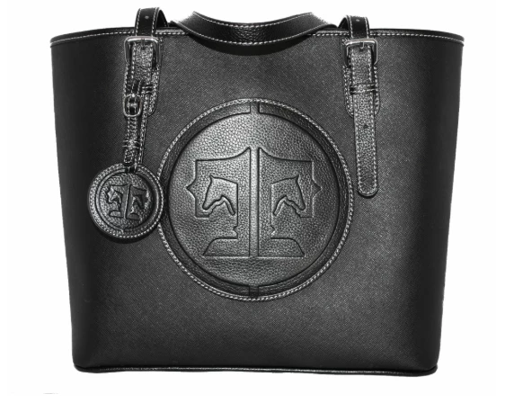 The James River Carry All ~ our most versatile and durable creation yet. This generous tote that does “carry all” is named in tribute to Jill’s father, who attended every show and the start of every hunt. Featuring scratch-resistant Saffiano leather exterior, this handbag stands firm on carrying daily essentials for busy barn days, travel, or the mobile office. The roomy scarlet interior contains pockets for smart phone, key fob, large zip pocket and tablet compartment with embossed leather logo. Completed with silver hardware and feet, embossed with the discipline of your choice in pebble-grain leather in contrasting color.