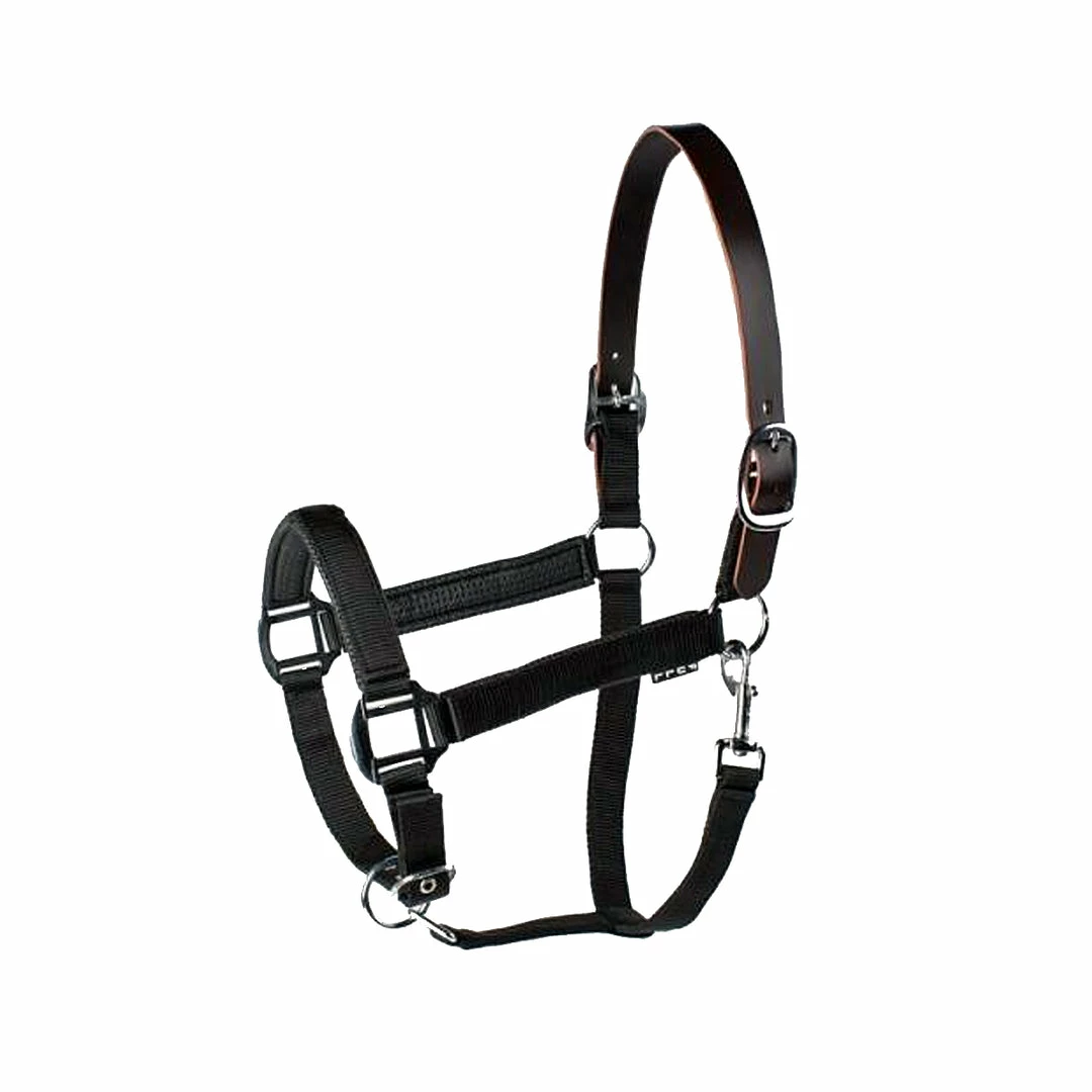 This halter features a padded noseband and cheeks. It has an adjustable crown and chin, with a replaceable leather break-away piece for the crown.